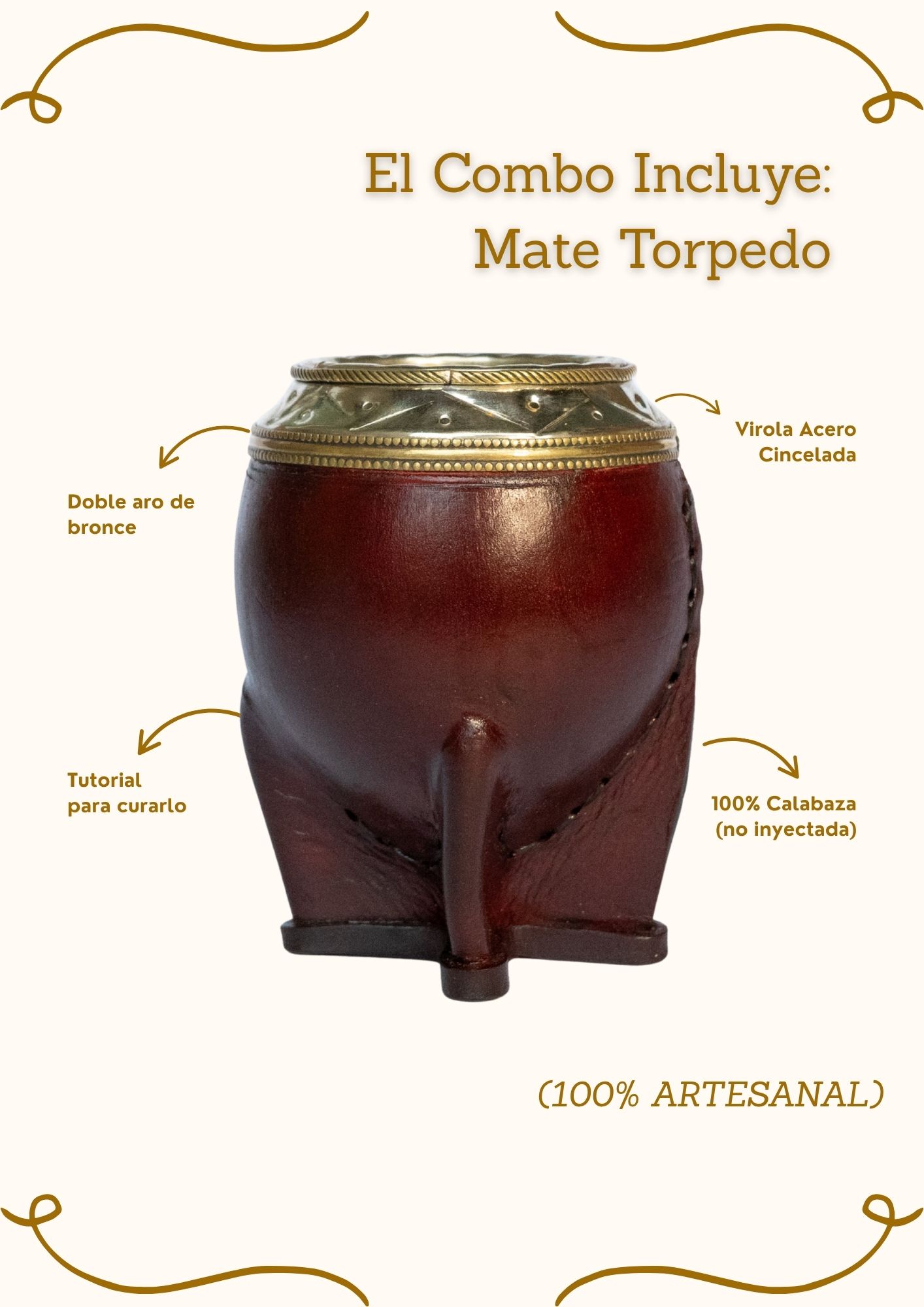 • Mate Torpedo de Calabaza con virola cincelada y doble aro de bronce.